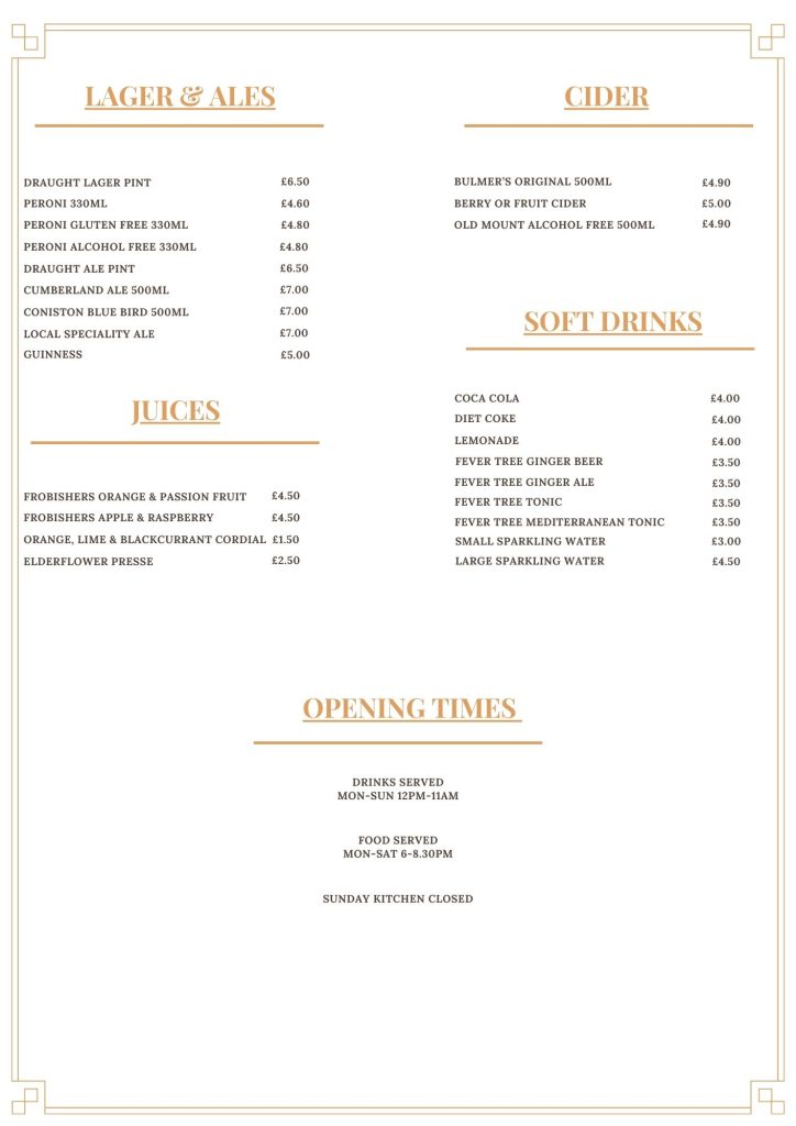 Drinks daily – 12 – 11.30pm – includes beer garden. Well behaved dogs allowed.